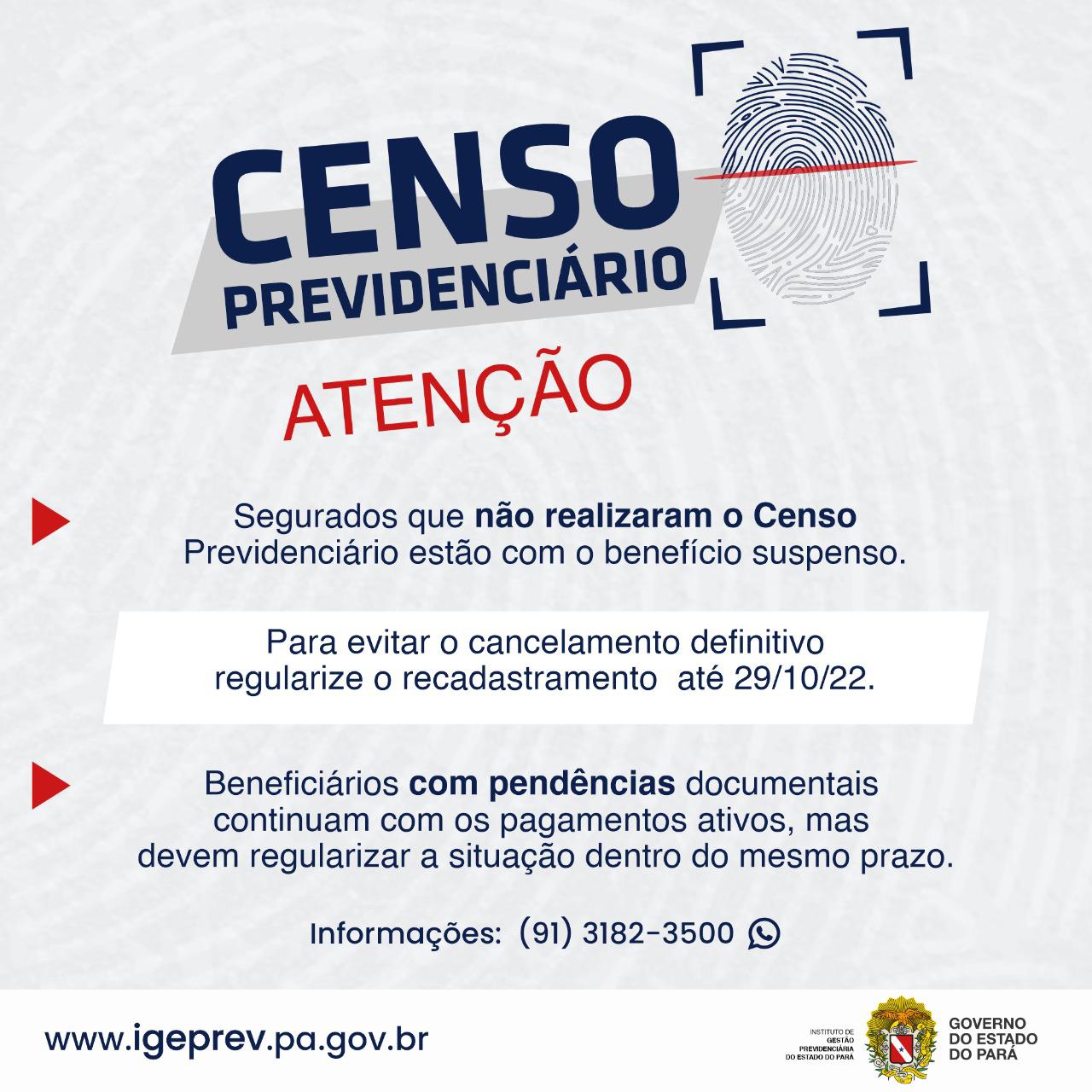 O Censo Previdenciário tem por objetivo atualizar os dados cadastrais e também viabilizar a elaboração de ações de gestão e educação previdenciária. É uma exigência da Lei Federal nº 10.887/2004 e Resolução 19.208, item 2.35 do TCE/PA, no que se refere ao princípio do equilíbrio financeiro e atuarial do Regime de Previdência dos Servidores Públicos. A não realização do Censo poderá ocasionar a SUSPENSÃO e até um possível CANCELAMENTO do benefício, conforme o Capítulo III, da Instrução Normativa do Censo Previdenciário Nº 001, de 08 de janeiro de 2020.