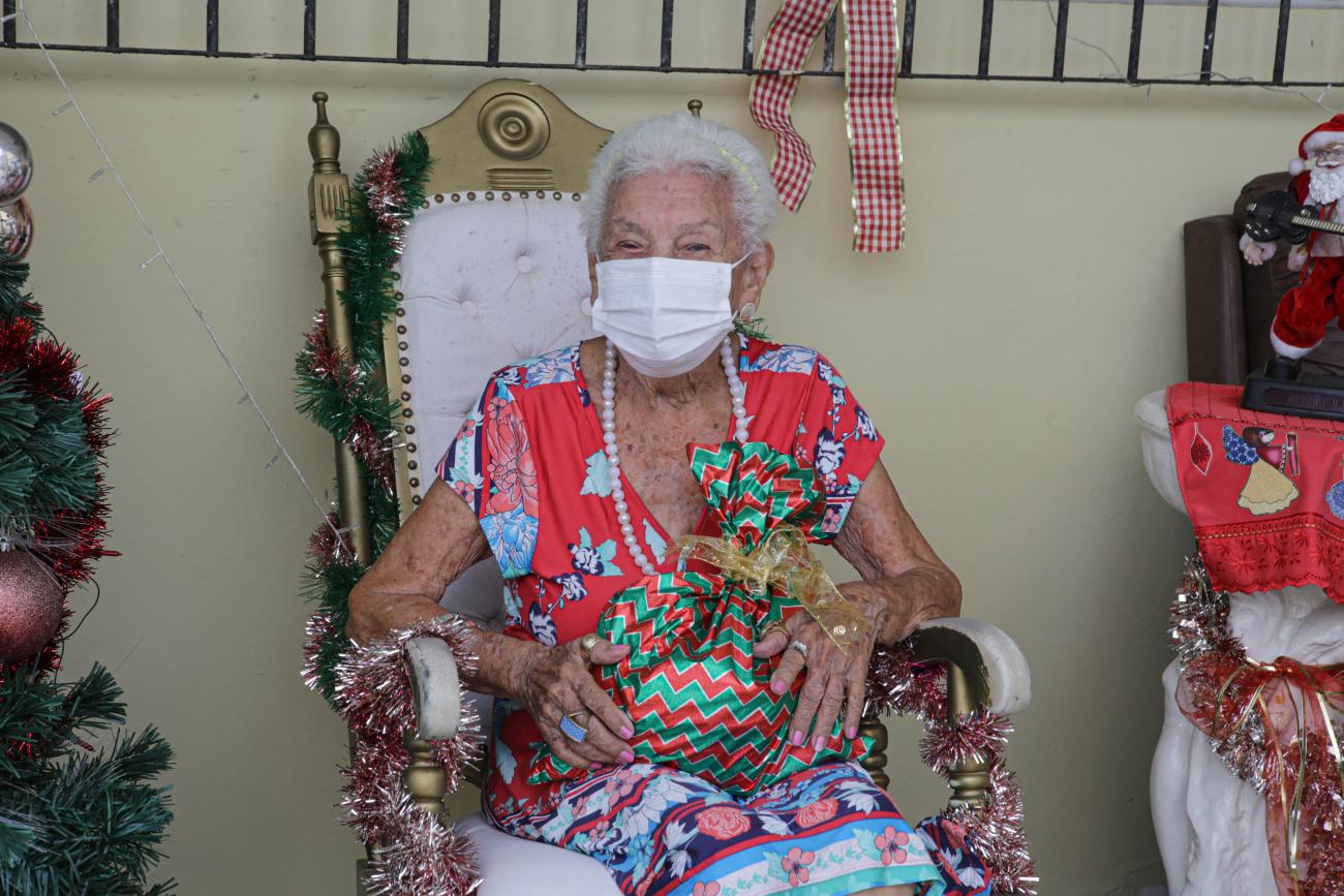 Aos 99 anos, Maria Moraes ficou muito feliz ao receber seus presentes e ouvir a mensagem escrita, especialmente para ela, lida pela técnica previdenciária Marcella Giordano. “Que a pessoa que escreveu a carta seja muito feliz e que esteja sempre aqui, olhando pela gente”, disse a idosa, que completará 100 anos no dia 20 de maio, e ainda gosta de ouvir os sambas-canções que ela dançava com o marido.