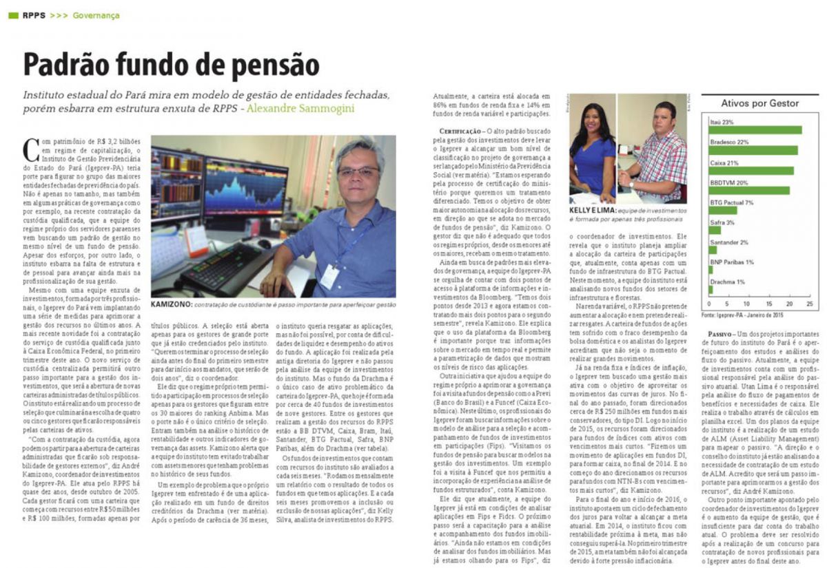 A matéria intitulada “Padrão fundo de pensão” menciona ainda a busca do Igeprev pelo bom nível de classificação no Programa “Pró-Gestão”, projeto de certificação dos RPPS criado recentemente pelo Ministério da Previdência Social, os planos do Instituto para ampliar a alocação da carteira de participações e o projeto da equipe do Nugin em investir, no futuro, na capacitação para a análise e acompanhamento dos fundos imobiliários.