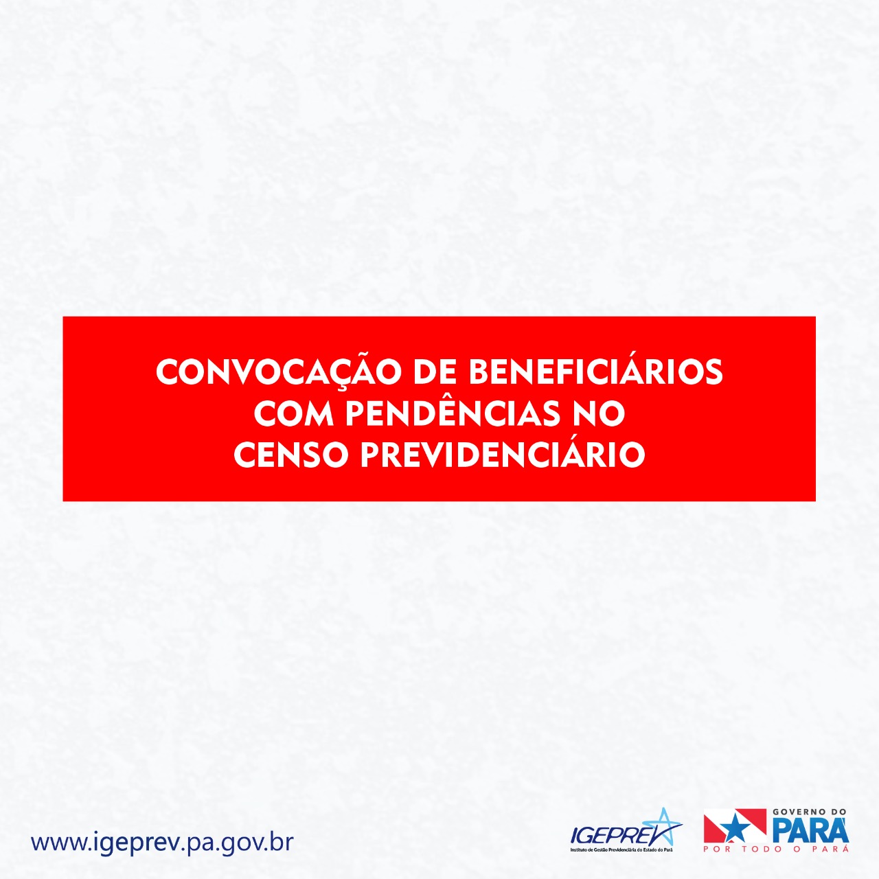 O Igeprev convoca os beneficiários listados no edital 005/2022 (clique no link abaixo para acessar) para comparecerem à sede do Instituto, agência de Castanhal, Terminal Hidroviário ou Unidades Móveis para entrega dos documentos pendentes do censo previdenciário, no período de 09/03/2022 a 08/06/2022. Não há necessidade de realizar agendamento. O não atendimento à convocação acarretará a suspensão do pagamento do benefício e seu posterior cancelamento.